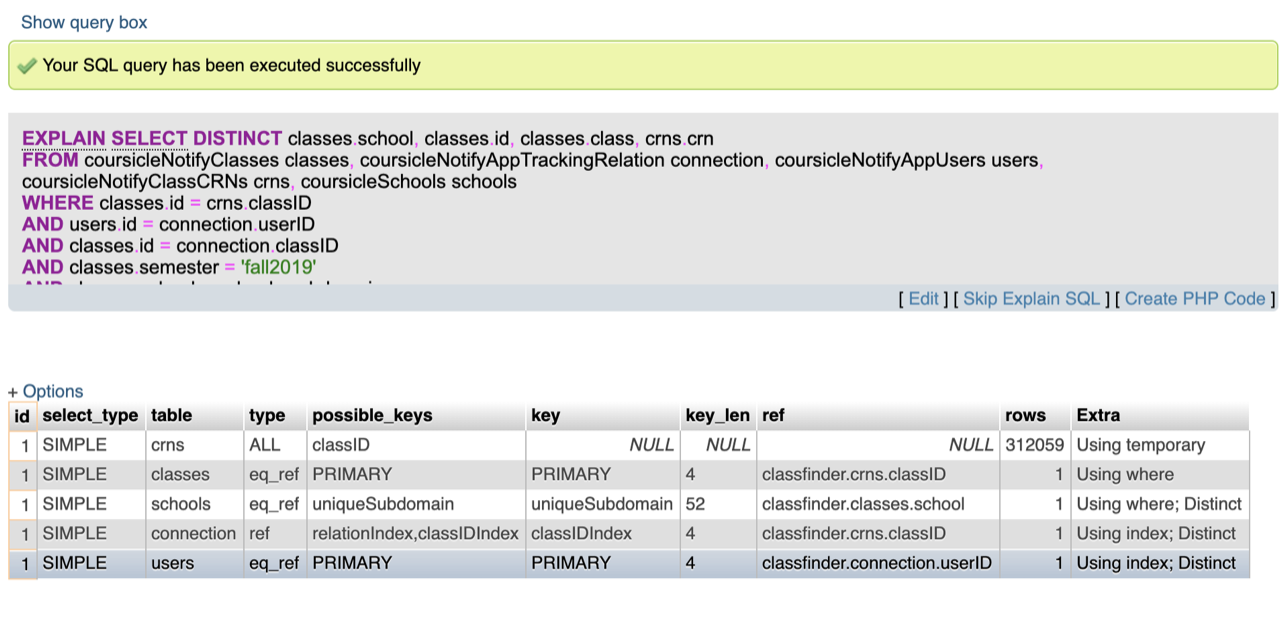 read moreOn Aug 26, 2019, at 1:47 PM, Ken Sillswrote: Hi Brad, Coursicle is having a complete db disaster right now and Joe (founder, cc'd) could use someone to bounce ideas off of. Joe knows you're spread beyond thin, but if you are interested in someone else's problems for a change... Thanks, Ken. Ken Sills, M.Eng. M.Sc. CEO and CoFounder Preteckt, Inc. 901.335.8447 Preteckt http://www.preteckt.com/ https://www.linkedin.com/in/kensills/ On Mon, Aug 26, 2019 at 3:54 PM Joe Puccio wrote: Ken, thanks so much for the introduction. Hi Brad, we actually met when I was in Memphis and you did a talk about technical debt. We're currently getting some incredible high, unexpected load on the Coursicle web server, which is causing production outages. Over the past four hours, we have narrowed things down to certain scripts which hit our MySQL database (which is hosted on the web server). The issue is we can't figure out why these scripts are causing this all of a sudden since nothing significant has changed since last week. The load on MySQL (load average is >100 on an 8 core machine) is causing MySQL connections to fail, meaning web traffic and the 1000+ people using Coursicle at any given period in the day, are being affected. We've been doing EXPLAINs on these queries and it looks like MySQL isn't using indexes that we've created even though it should be. As you can see from the screenshots, we have an index called `classID` on the crns table, but it's not being used in the query for some reason. When we did FORCE INDEX on that index, it started using the index, but it stopped using one of the other indexes it was using. I've also attached our MySQL config file, in case that could be the issue. We honestly haven't had to mess with it up until this point. Best, Joe Puccio Co-founder, Coursicle joe@coursicle.com ![]()