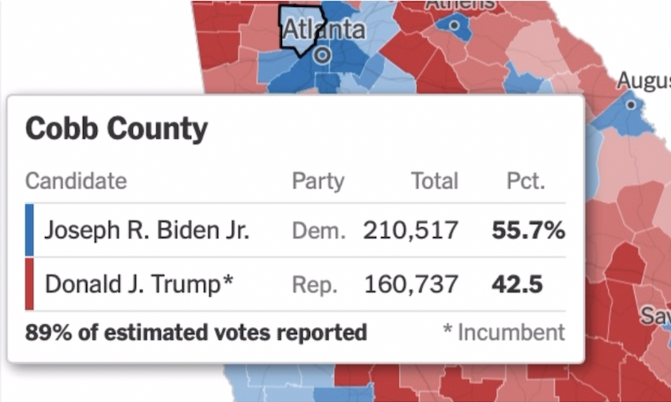 And here it is. 4:32am, November 6th. 1.824 votes were just added. 87% of them went to Biden. Biden is now 🎉WINNING🎂 Georgia by a margin of 917 votes. I think Biden's margin will grow throughout the day. And just like that, Trump is toast. Even if he manages to win every other state: Arizona, Pennsylvania, Nevada, Alaska, the last delegate from Maine, and North Carolina, an exceedingly unlikely scenario, he will only get to 269 votes. If they both tie at 269, the president I believe is determined by the house and the vice president by the senate. The last time Georgia went for a democrat was 1992.