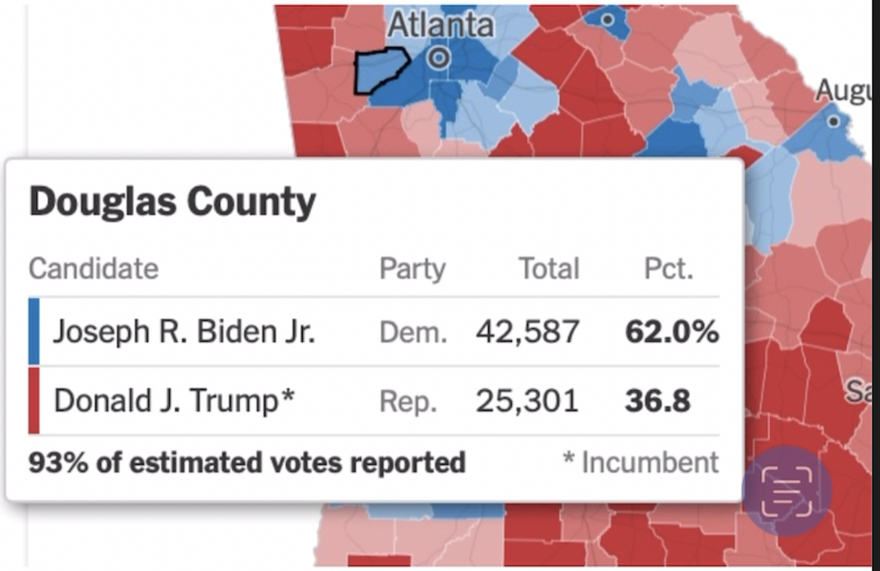 Suprisingly, only a few of my friends were following the 2020 election data closely. One of them was my friend Li, and me being as impatient as I am and Li being as good at spreadsheets as he is, we set up some incredibly simple modeling on the remaining states to see if we could predict who would win. All we did was copy and paste the NYT data, determine the current margin of Trump to Biden votes for each county, and then figure out how many more votes would go to Biden or Trump (assuming of course the margin held; although at times we allowed for some skew for mail in votes, because those tend to be more blue). While everyone was freaking out on election night about Nevada and Pennsylvania, we were freaking out about Georgia because it looked like it was going to flip blue for the first time since 1992.