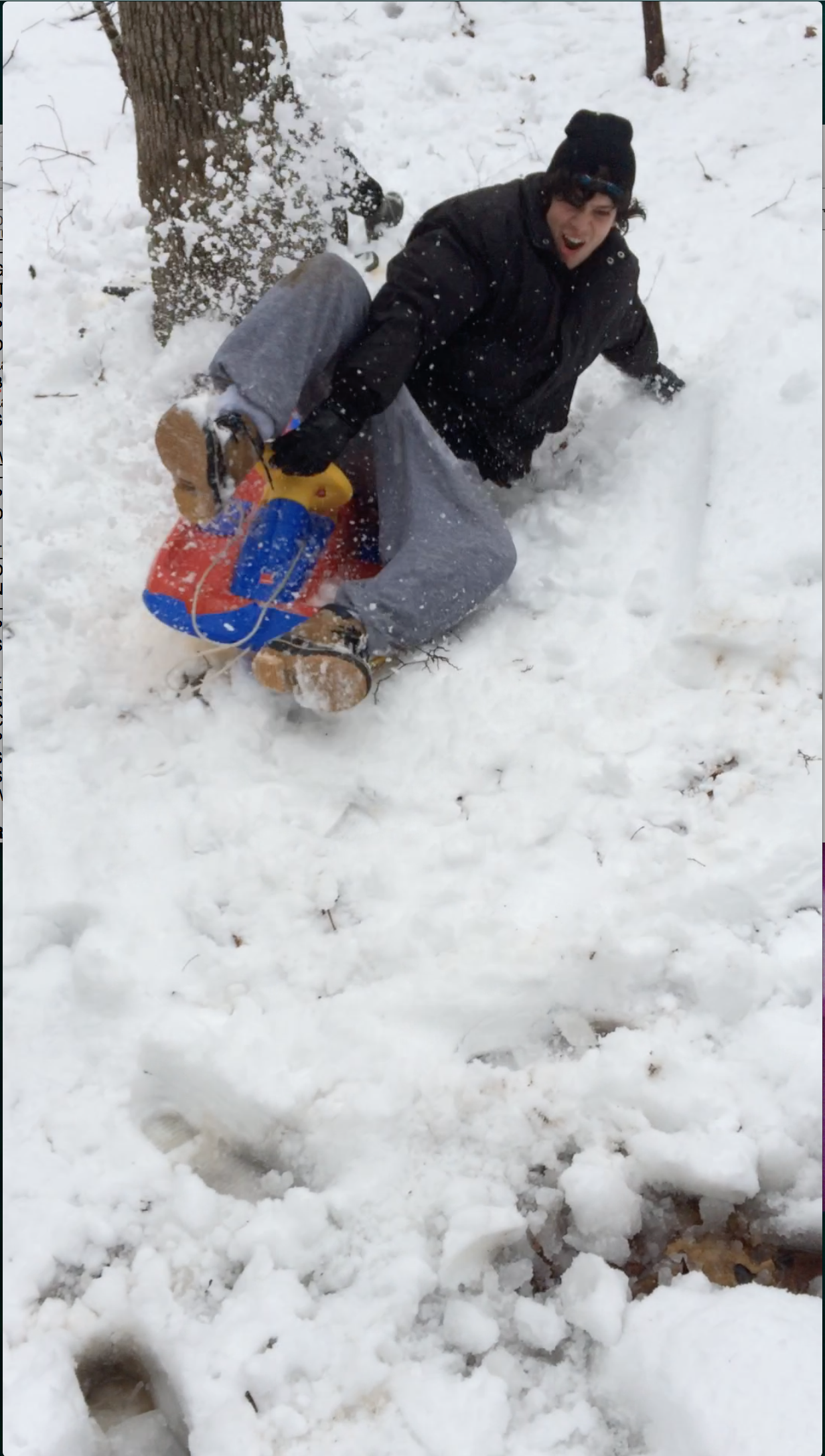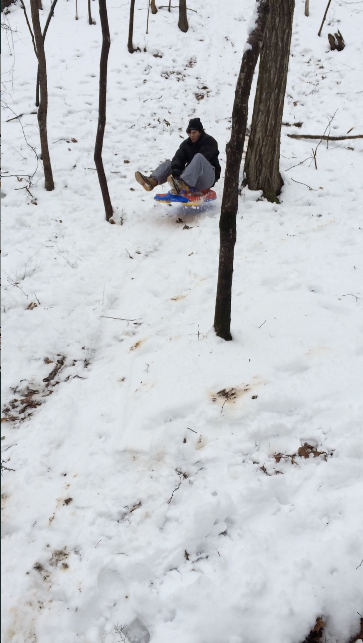 Behind our house there's a very steep hill. It's a rather treacherous path for sledding given you have to dodge trees on the way down but it's the best we've got. Only ended the day with a couple bruises. Success.