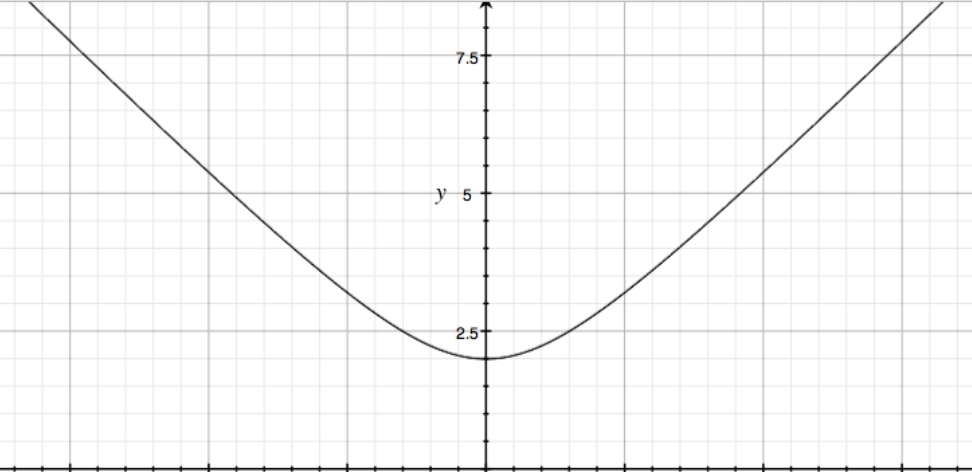 This function appears parabolic near x=0 while it approaches linearity as x goes to positive and negative infinity. Observing the derivative confirms this: