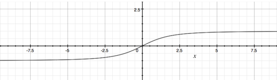 This graph has horizontal asymptotes at y=1 and y=-1. This means it never quite reaches linearity...why? All right, let’s look at this point by point. Well, near the origin, the variation of x isn’t having much of an effect so the value of the derivative is going to be small.