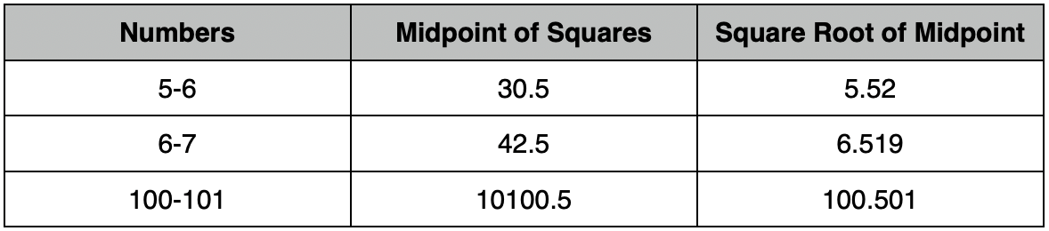 read moreLook at the tendency of a square root to lean to either of the two nearest squares as a function of the size of the number.