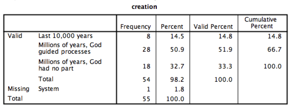 In a survey of 55 University of North Carolina at Chapel Hill students, the following question was asked: “Which of the following statements comes closest to your views on the origin and development of human beings? ”. (Note: exact answer options are detailed in a subsequent paragraph). Of the 55 respondents, 14% believed that God created human beings as they are now within the last 10,000 years, 51% believed that human beings have developed over millions of years with God guiding this process, 33% believed that humans have evolved over millions of years and God had no part in this process, and 2% abstained from answering. Below is a table with the statistics: