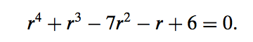 Trick for figuring out roots of high order equations: look at ratios of factors of a_0 and a_n, so look at factors of the first coefficient and the last coefficient, and then take the ratio of latter over the former. You should do plus/minus for each value. Try that for a possible r, and repeat until you find a few. If you’ve found as many as n, then you’re done. If you haven’t, then divide the polynomial by the roots you found (so like long divide (r-3) into r^4+r^3…etc).