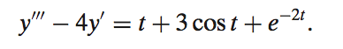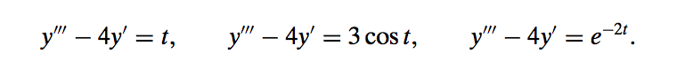 For the particular solution, we look at the solutions to the equation (e^t, t*e^t, etc) and choose a solution of the farm Y(t)=At^n+1*e^t where n is the highest degree solution??? (is this really the case, idk). So given our guess of this form, Y(t), then we can use professor’s method, or differentiate Y(t) three times, and then substitute y and its derivatives, and set it equal to the right hand side or something. Solve for all the undetermined coefficients. Need to look over method of undetermined coefficients. Maybe go to office hours.
